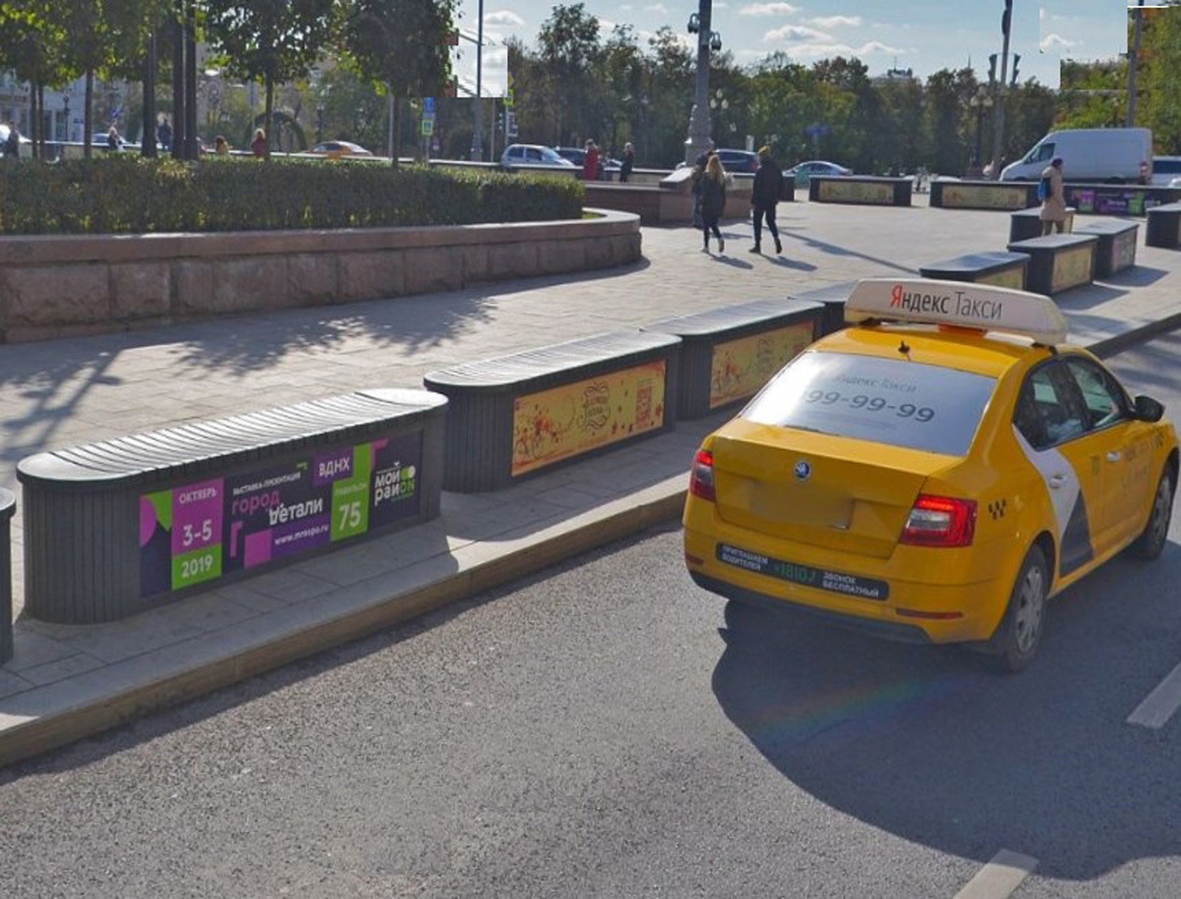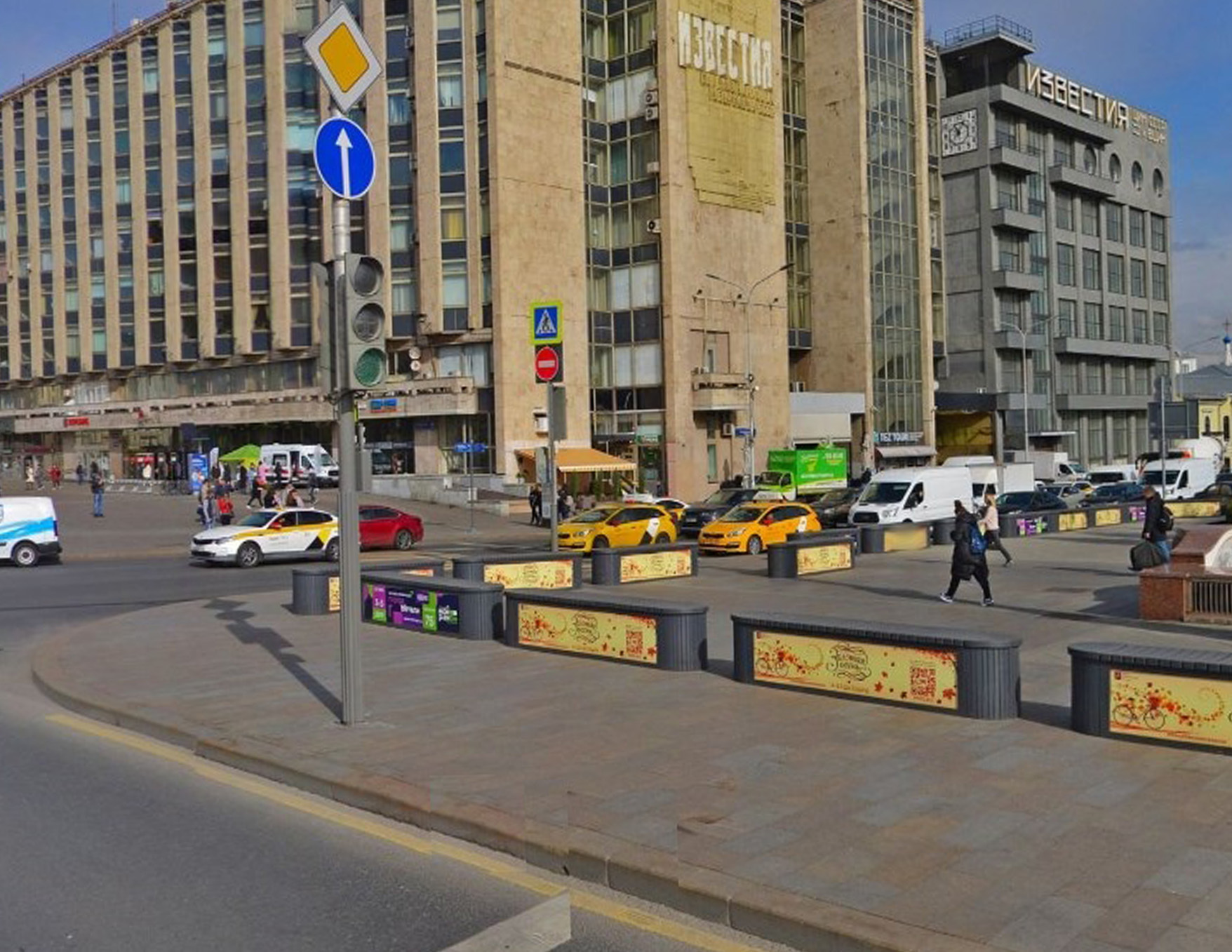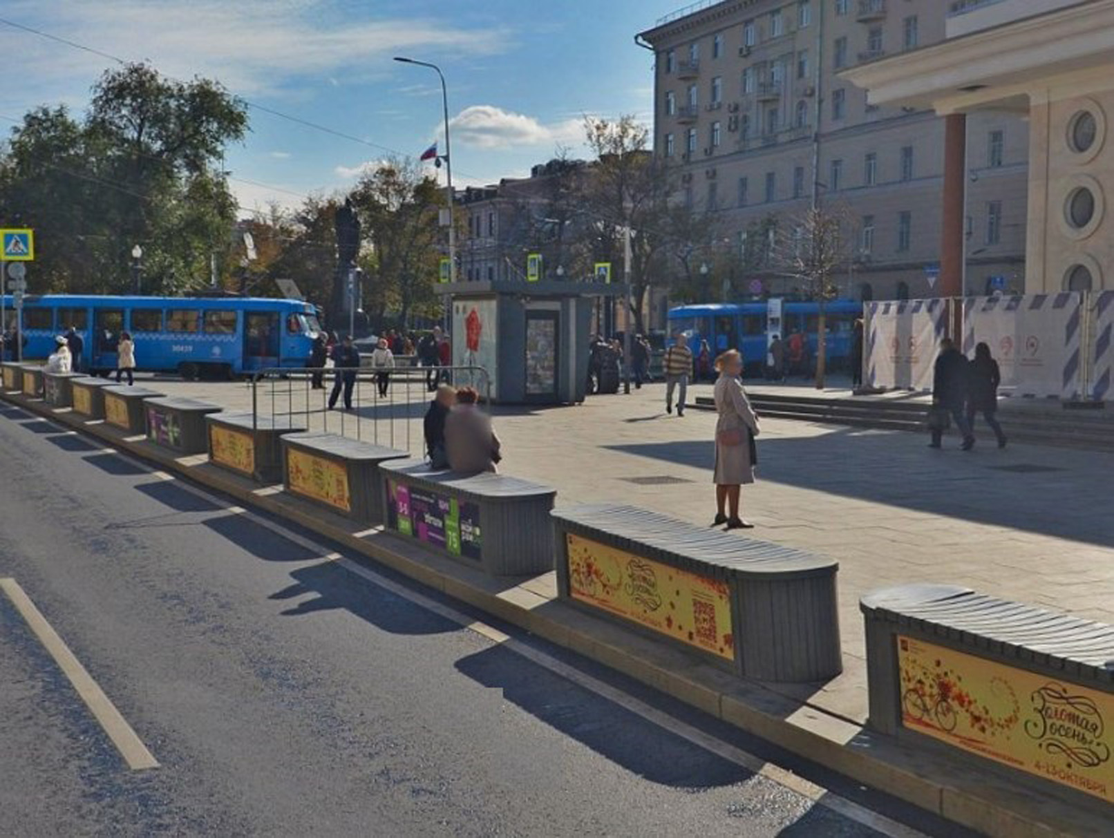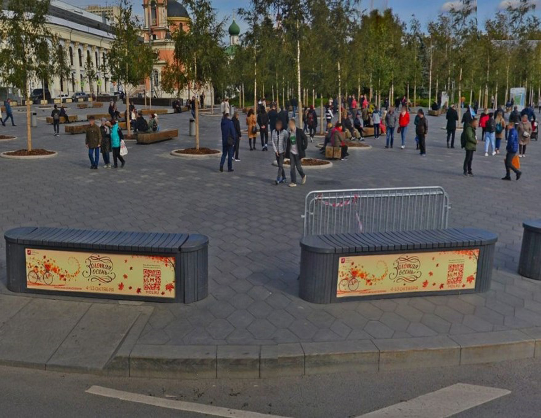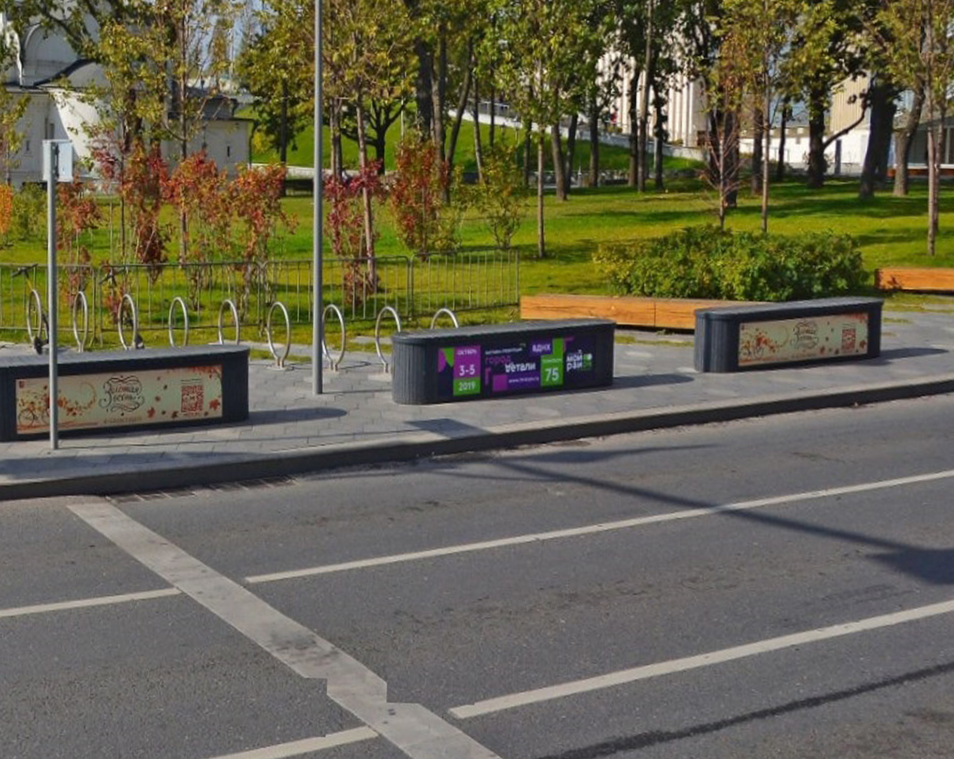 Таким образом, благодаря идеальным пропорциям рекламного поля скамейки размещение рекламы становится максимально эффективным и недорогим.