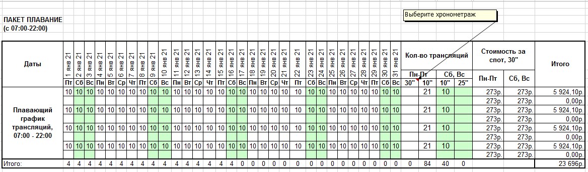 Медиаплан необходим для того, чтобы наглядно увидеть в какое время и по каким дням выходит реклама на радио.