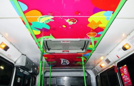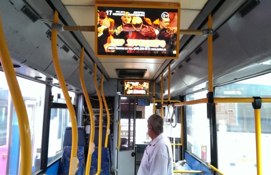 Реклама на/в автобусах – это рекламное объявление, размещенное как внутри салона автобуса (листовки, постеры, мониторы), так и снаружи (оклейка дверей, бортов, заднего стекла, полностью кузова транспортного средства), сообщающее пассажирам, прохожим, а также водителям частных авто информацию о предлагаемых товарах, услугах и местах их приобретения.