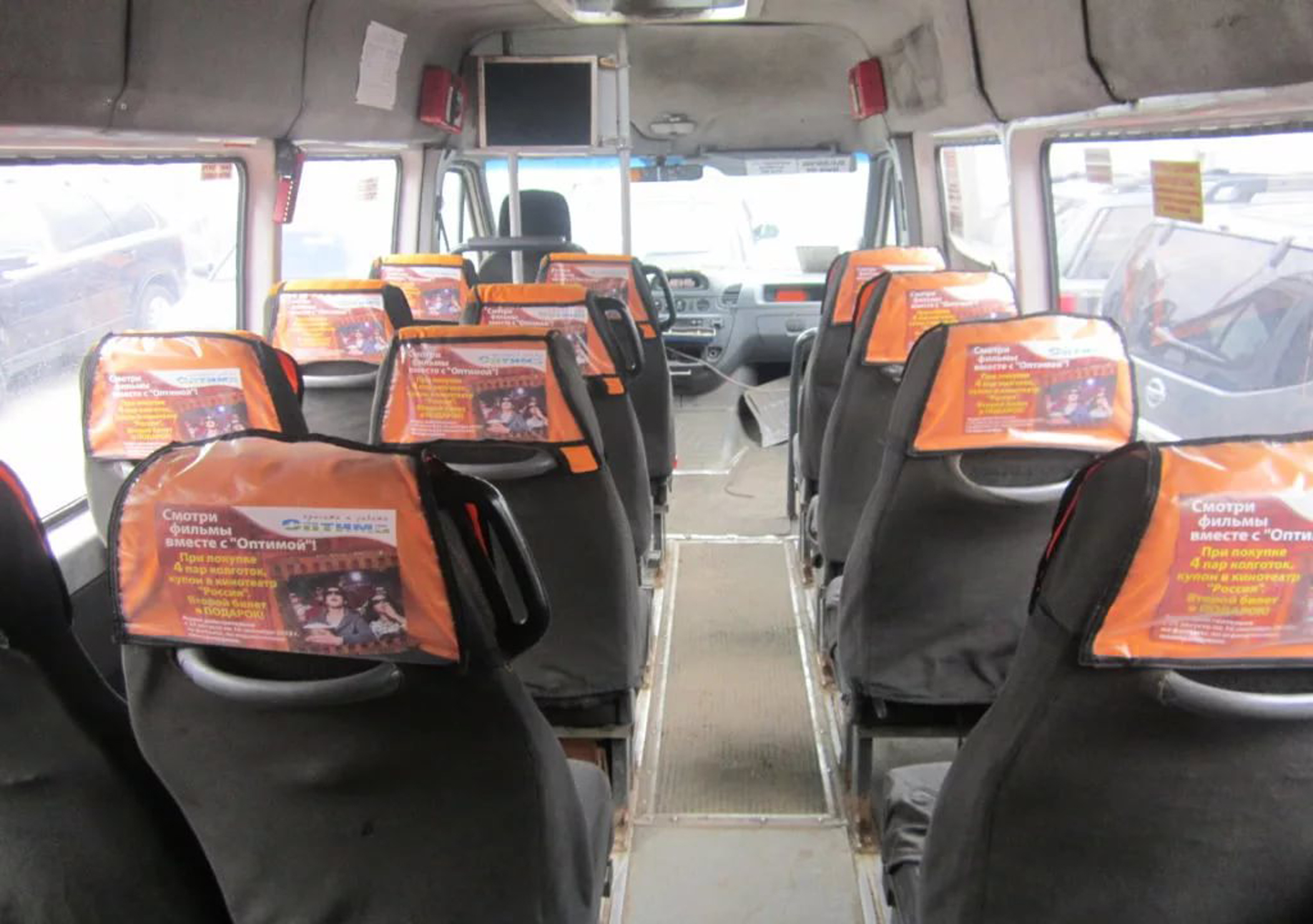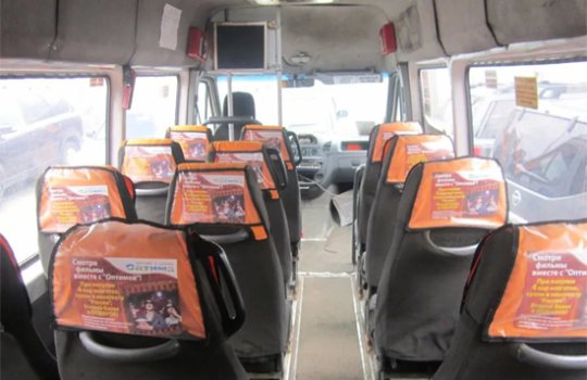 Реклама на подголовниках в междугороднем автобусе на фото выше