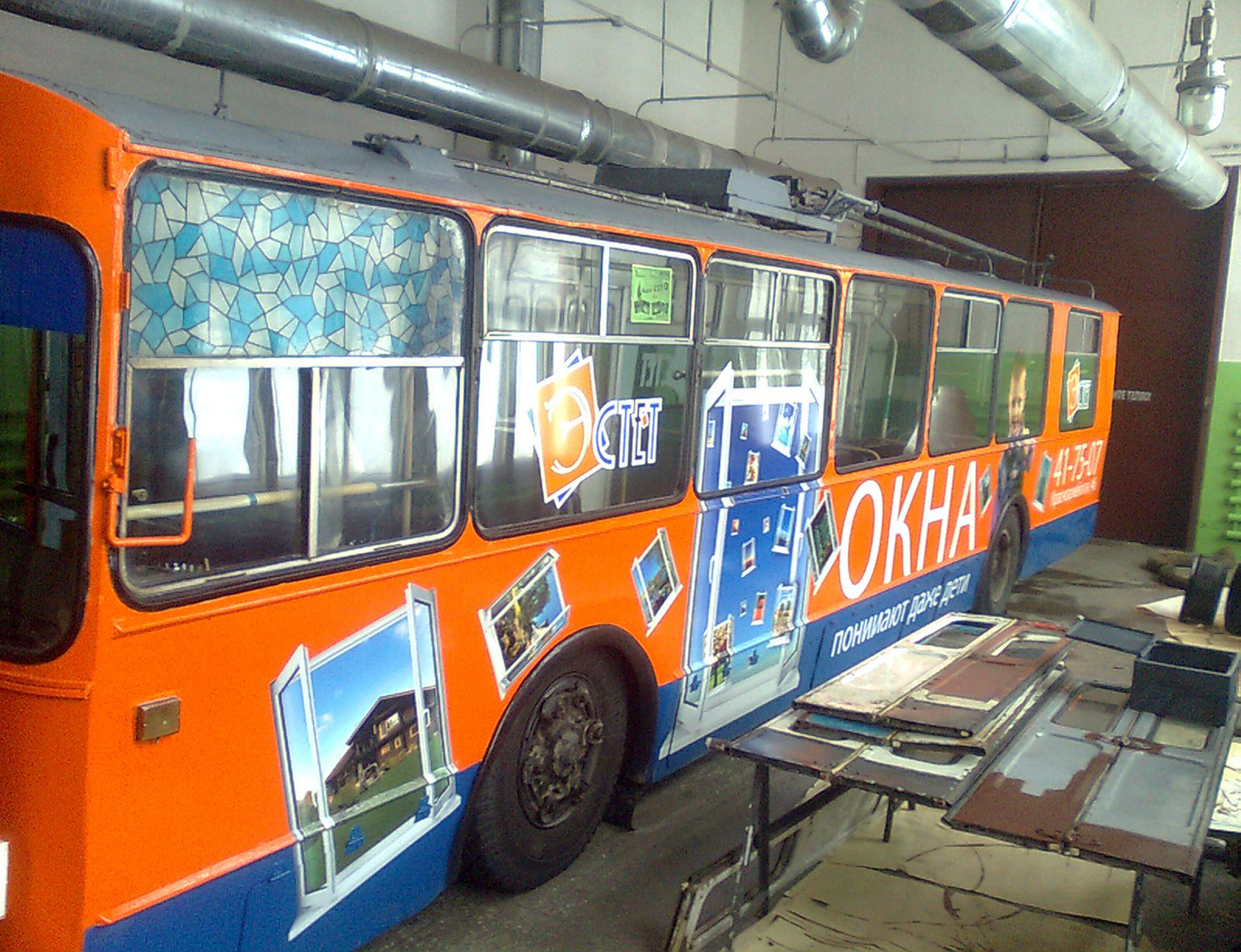 3) процесс брендирования (оклейки) троллейбуса рекламой: