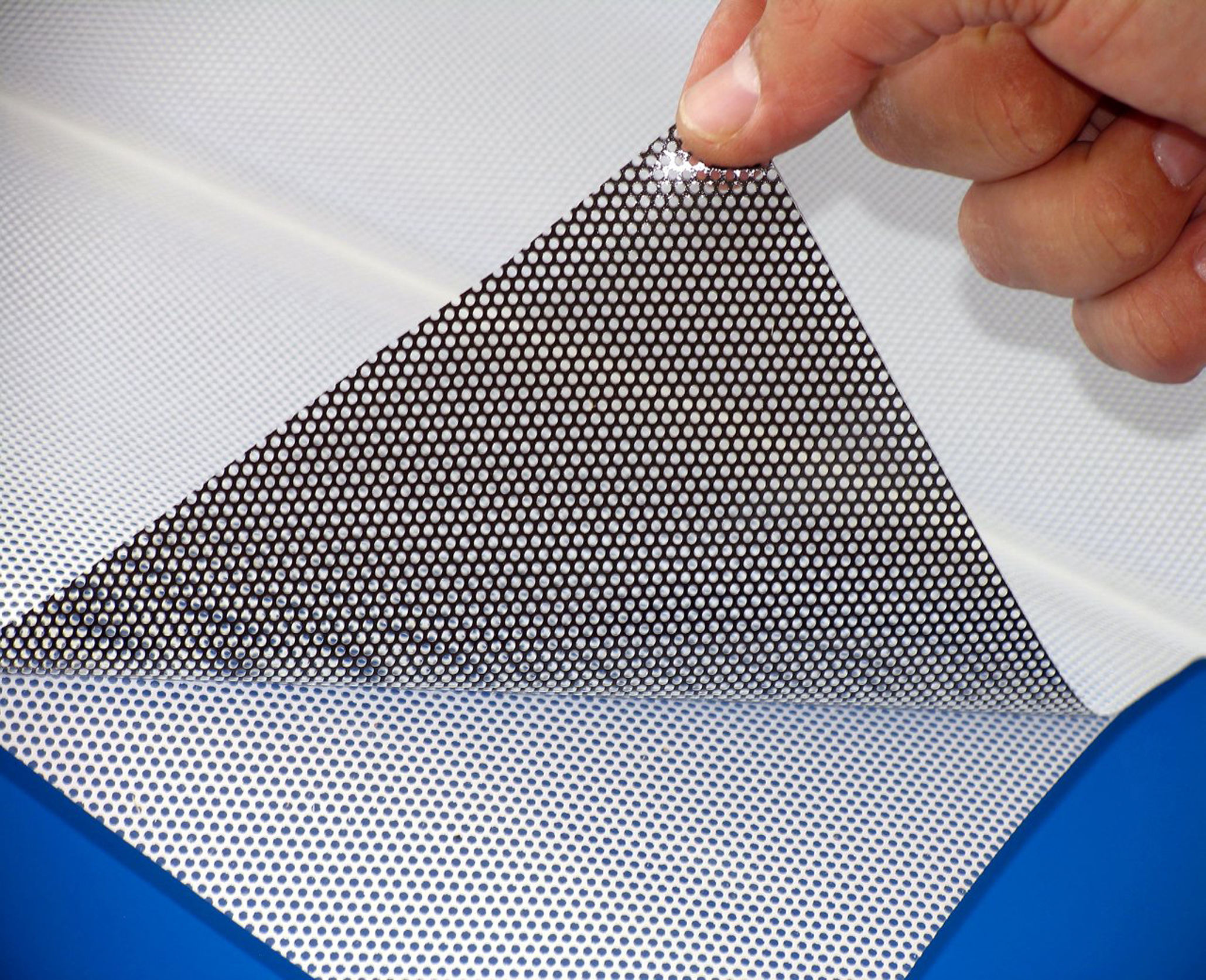 Перфорированная пленка представляет собой ПВХ-пленку с клеевым слоем и перфорационными отверстиями, занимающими до половины всей ее площади. Перфорированная пленка используется для оклейки стекол троллейбуса.