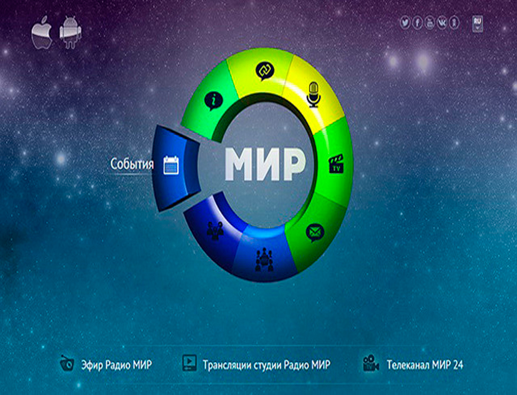 Мир – это международная телерадиокомпания (МТРК), которая была основана соглашением глав государств-участников СНГ 9 октября 1992 г. В состав МТРК «Мир» входят телеканалы «Мир», «Мир 24», «Мир HD», радиостанция «Мир», а также информационно-аналитический портал «MIR24.TV». Головной офис находится в Боровичах; филиалы и представительства – в 9 странах СНГ. Вещание осуществляется на русском языке. Председателем МТРК «Мир» и руководителем одноименного канала является Радик Батыршин. С 2017 г. слоганом МТРК «Мир» является фраза: «Телеканал многих столиц».