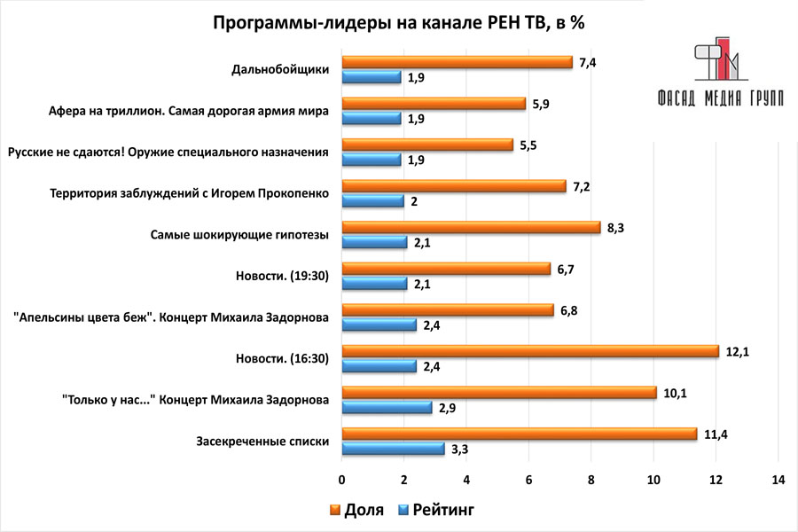Популярность телеэфира на «РЕН ТВ» приводит к ежегодному увеличению спроса на рекламное время. Для привлечения клиентов из разных регионов России, увеличения процента продаж, повышения имиджа компании и узнаваемости бренда – размещайте рекламу на «РЕН ТВ». «РЕН ТВ» – это проверенный и востребованный канал для размещения рекламы на боровичском ТВ. Для размещения рекламы на телевидении обращайтесь в рекламное агентство «Фасад Медиа Групп». Будем рады сотрудничеству.