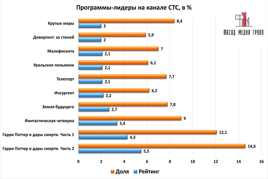 Популярность телеэфира на «СТС» приводит к ежегодному увеличению спроса на рекламное время. Для привлечения клиентов из разных регионов России, увеличения процента продаж, повышения имиджа компании и узнаваемости бренда – размещайте рекламу на «СТС». «СТС» – это проверенный и востребованный канал для размещения рекламы на боровичском ТВ. Для размещения рекламы на телевидении обращайтесь в рекламное агентство «Фасад Медиа Групп». Будем рады сотрудничеству.
