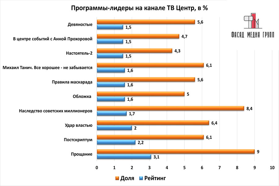 Популярность телеэфира на «ТВ Центр» приводит к ежегодному увеличению спроса на рекламное время. Для привлечения клиентов из разных регионов России, увеличения процента продаж, повышения имиджа компании и узнаваемости бренда – размещайте рекламу на «ТВ Центр». «ТВЦ» – это проверенный и востребованный канал для размещения рекламы на боровичском ТВ. Для размещения рекламы на телевидении обращайтесь в рекламное агентство «Фасад Медиа Групп». Будем рады сотрудничеству.