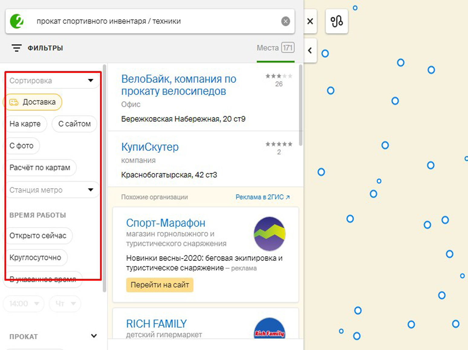 Пример приоритета в рубрике представлен 2ГИС (Двагис, ДубльГис) на фото: