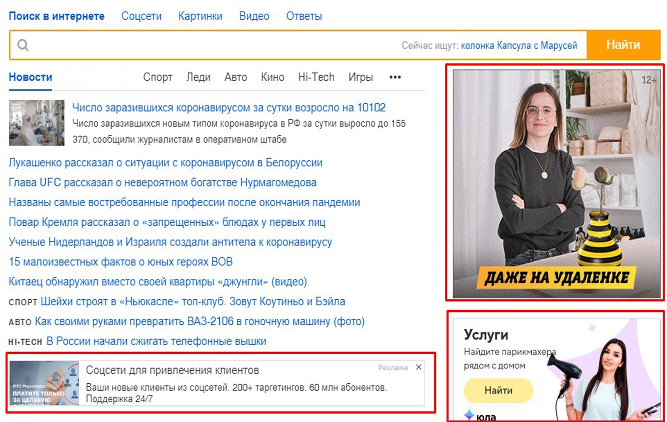 2. В зависимости от содержания рекламного объявления в Mail.ru (Мэйл):