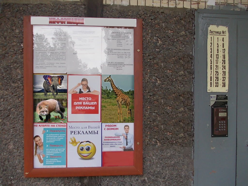 Реклама в подъездах отличается тем, что рекламные материалы располагаются на уровне глаз потенциального клиента или покупателя. Удачное расположение рекламы приводит к тому, что листовки, буклеты и другие форматы рекламы в подъездах хорошо видны и обеспечивают 100% читаемость со стороны жильцов дома.