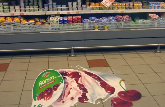 Пример рекламы в напольной конструкции в супермаркетах: